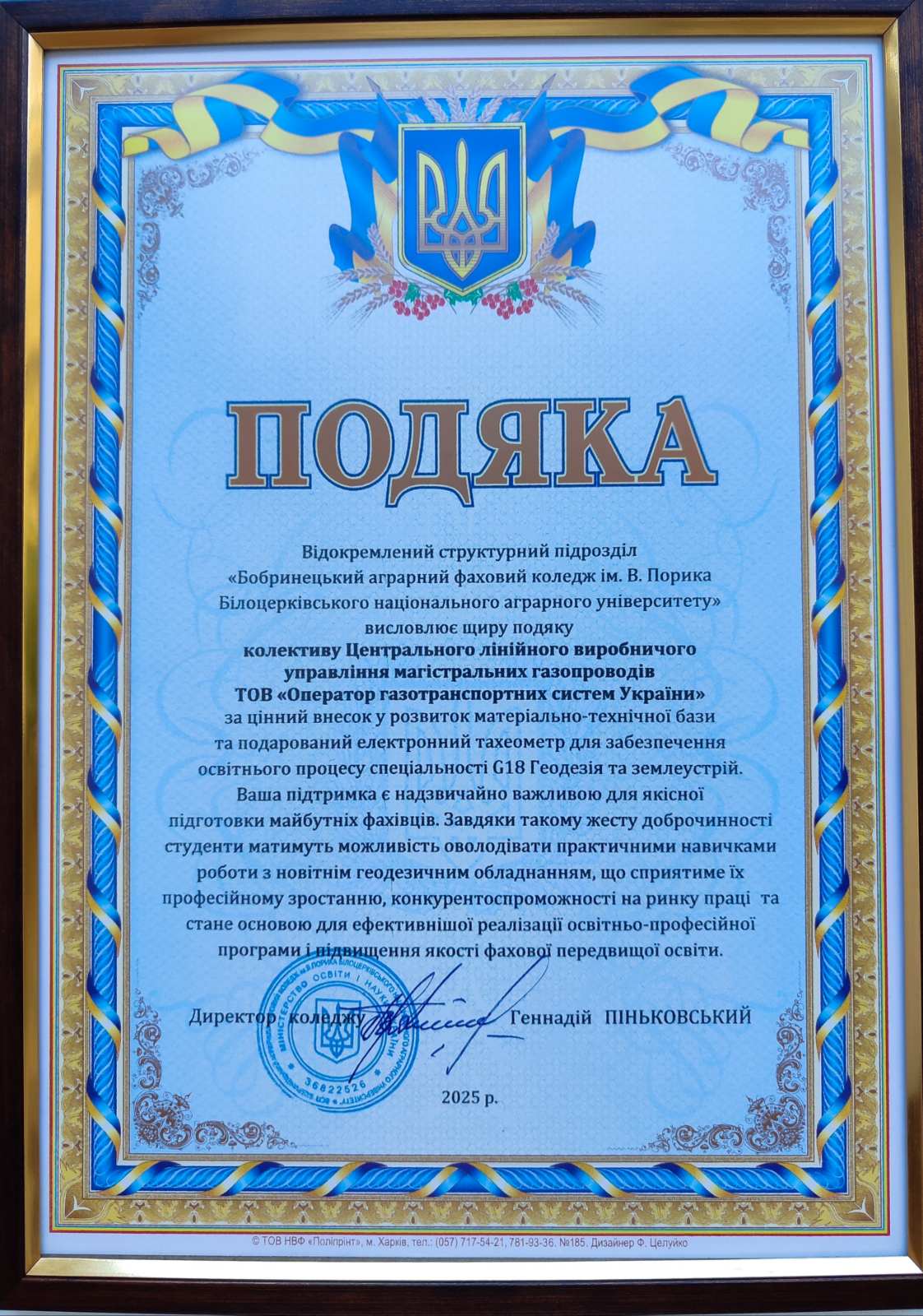 Адміністрація та колектив коледжу  висловлюють подяку працівникам Центрального лінійного виробничого управління магістральних газопроводів ТОВ “Оператор газотранспортних систем України” за вагомий внесок у розвиток матеріально-технічної бази закладу. Окрема подяка – нашому випускнику Олександру Бардику, за ініціативу та сприяння у передачі такого важливого обладнання для підготовки майбутніх геодезистів. Отримання електронного тахеометра – це важливий крок уперед у розвитку коледжу та підтвердження того, що наші студенти матимуть усі умови для здобуття якісної, сучасної та конкурентоспроможної освіти.
