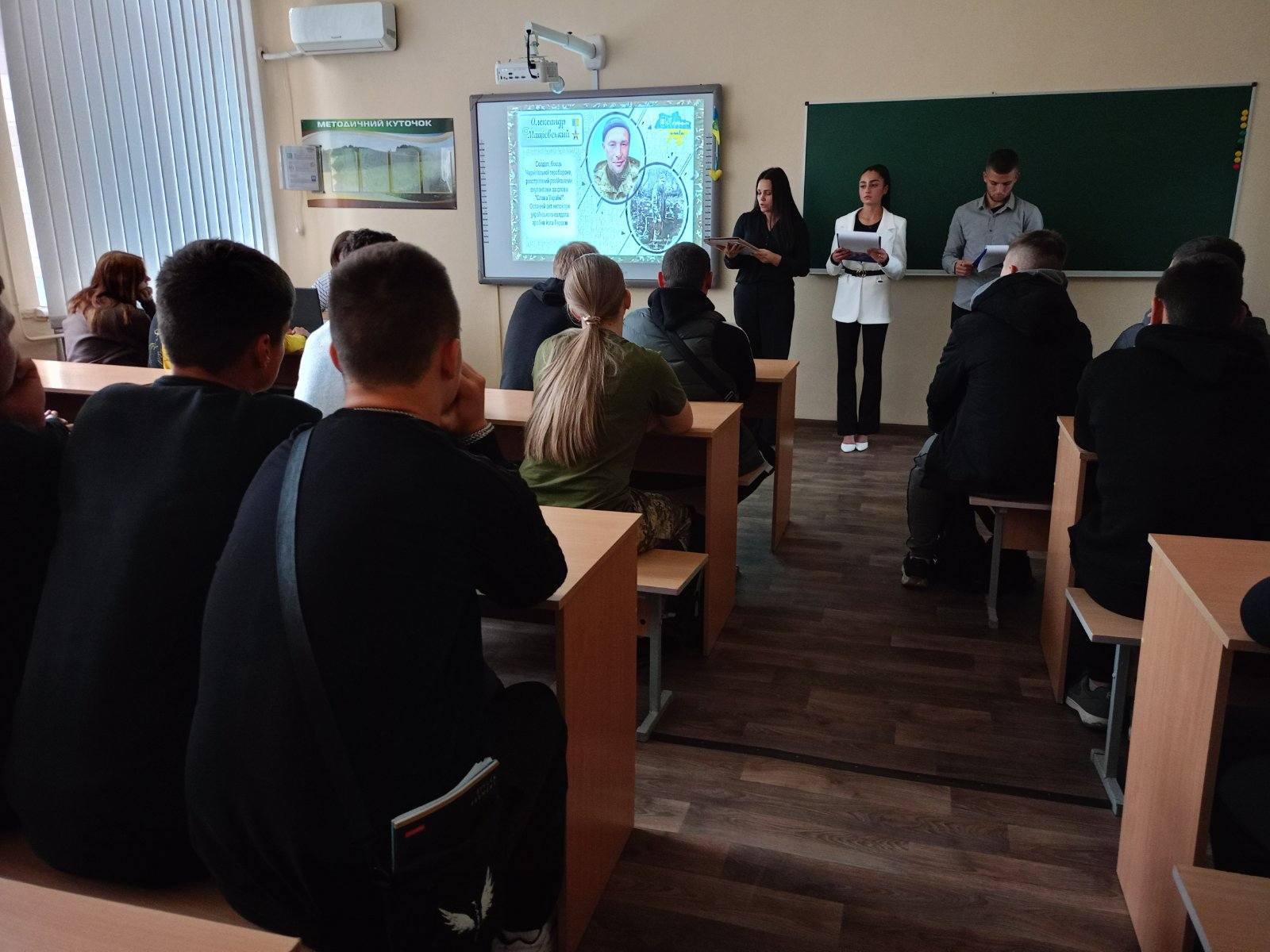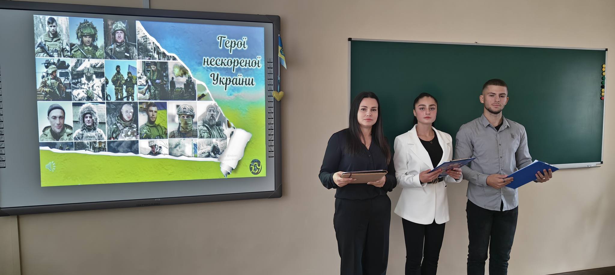 Сьогодні у нашому закладі панувала особлива атмосфера – пам’яті, поваги та безмежної вдячності. Викладачі Чичирко Я. М. та Протасова І. М. разом зі студентами Гурою Русланою та Щербиною Станіславом провели захід, присвячений Дню Захисників і Захисниць України на тему «Герої нескореної України». Студенти дізналися про 12 українських героїв, які своєю мужністю, силою духу та самопожертвою наблизили для нас найцінніше — мирне небо над головою. Ці історії — лише маленька частина тисяч і мільйонів прикладів героїзму. Та саме вони яскраво доводять: сила українського народу — у його згуртованості, любові до Батьківщини та незламності.