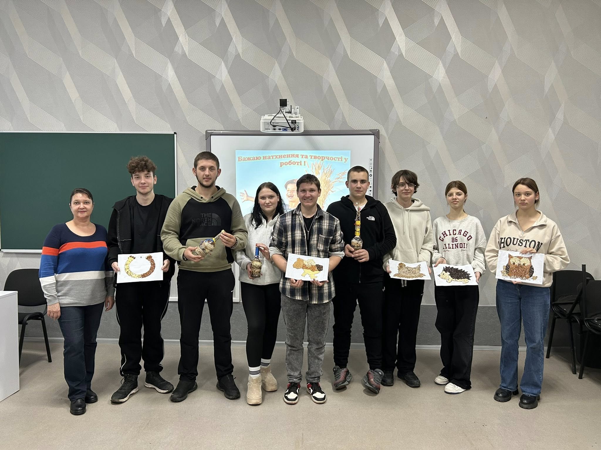 Унікальні композиції з насіннєвого матеріалу створювали студенти ІІ та ІІІ курсів під час засідання гуртка на тему: «Еко-арт захід – життя з насіння», де вони навчалися компонувати кольори, форми і текстуру насіння для створення гармонійних творів, та отримали досвід у техніці «насіннєвої мозаїки». Студенти клеїли насіння відповідно до попередньо підготовлених ескізів, була акцентована увага на використанні різних розмірів і кольорів насіння для створення об’єму та текстури.