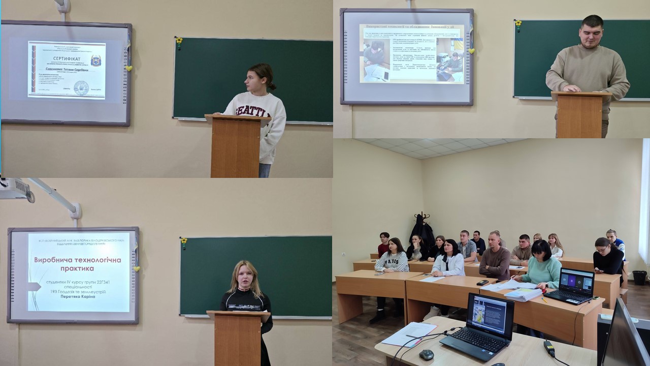 Голова циклової комісії спеціальності G18 «Геодезія та землеустрій» Ірина Прокопенко ознайомила учасників із вимогами до оформлення звіту-щоденника з практики, провела аналіз типових помилок та надала практичні рекомендації здобувачам освіти. У другій частині конференції за присутності роботодавця, керівника віб бази практики сертефікованого інженера-землевпорядника Петровича Івана Івановича було приділено увагу звітам здобувачів освіти IV курсу про проходження технологічної практики, у межах яких студенти презентували результати своєї практичної діяльності та набуті професійні компетентності.